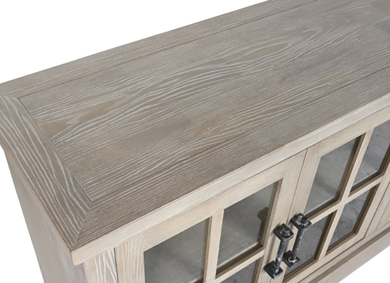 Este aparador de estilo clásico está fabricado en madera de hevea con acabado natural, un material resistente y duradero, combinado con puertas de cristal que aportan ligereza visual y un toque sofisticado.
