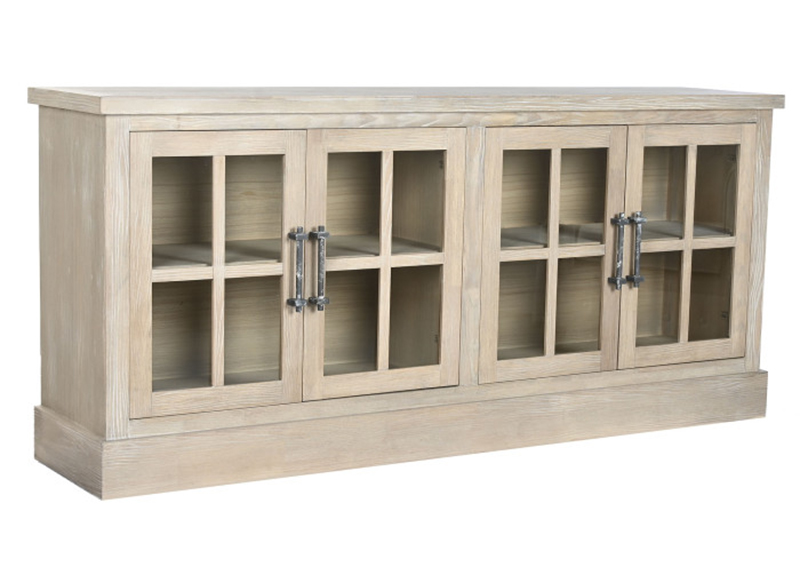 Aparador rústico de líneas clásicas con puertas de cristal y balda interior fabricado en madera natural clara de hevea, de excelente calidad por ser solida y duradera.