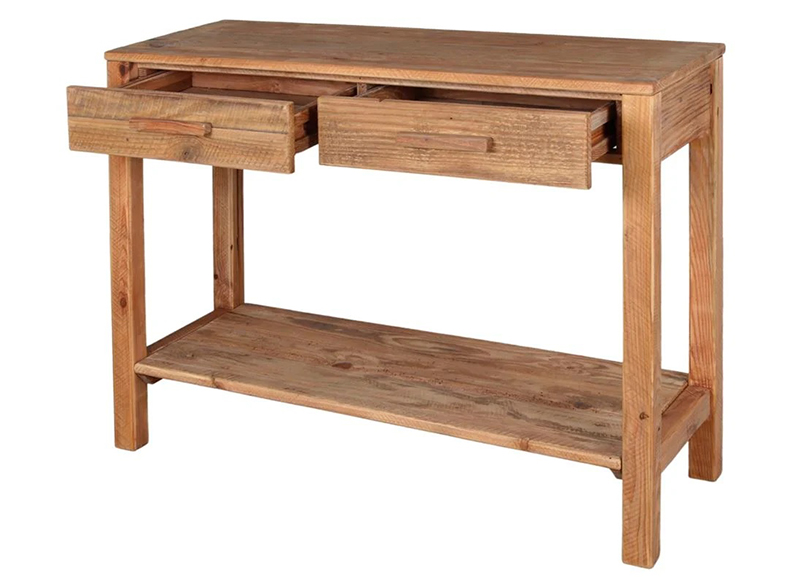 Esta consola pequeña de pino reciclado aporta orden y encanto rústico a tu entrada. Con dos cajones y balda inferior, te permite mantener la superficie despejada y crear un recibidor cálido.