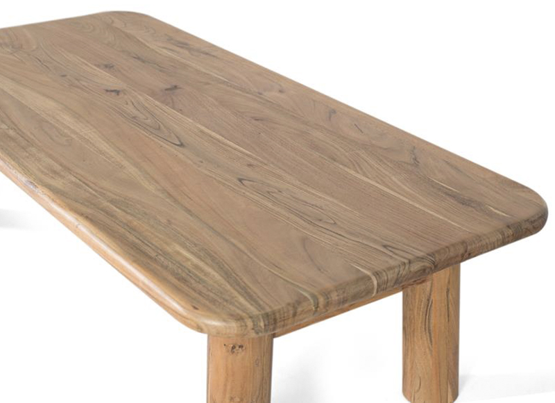 Mesa de centro rústica grande fabricada en madera maciza de mango con un tablero de gran grosor y unas robustas patas en forma cilíndrica.