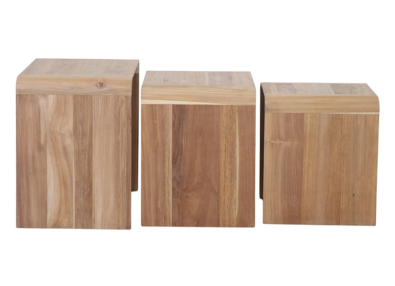 Conjunto de tres mesas auxiliares tipo nido hechas en madera de teca natural lo que puede hacer que presente nudos, vetas y alguna pequeña variación de tono propia de la madera, lo que le da un valor añadido.