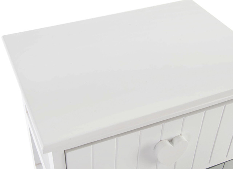 Cada cajón cuenta con tiradores de madera en forma de corazón, un detalle único que añade calidez y un aire romántico, convirtiendo este mueble en una pieza especial dentro de cualquier estancia. Su tamaño compacto lo hace perfecto como mueble auxiliar para dormitorio, baño o salón, ofreciendo espacio de almacenamiento sin ocupar demasiado.