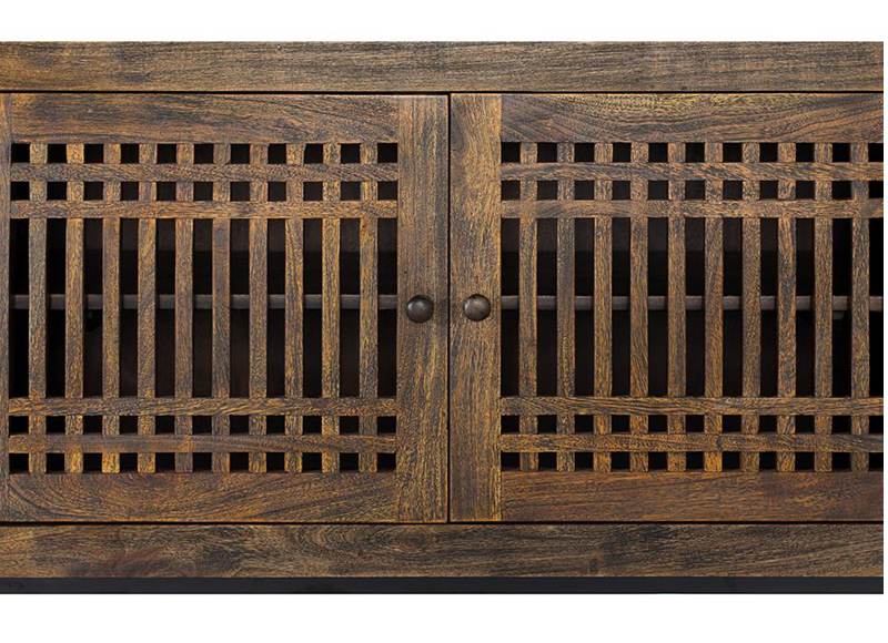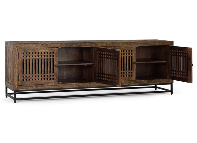Cuenta con 4 puertas con celosía y estante interior, perfectas para mantener tus dispositivos electrónicos, mandos y objetos personales organizados y fuera de la vista. Su base en patas de acero negro aporta ligereza visual y estabilidad a la vez.