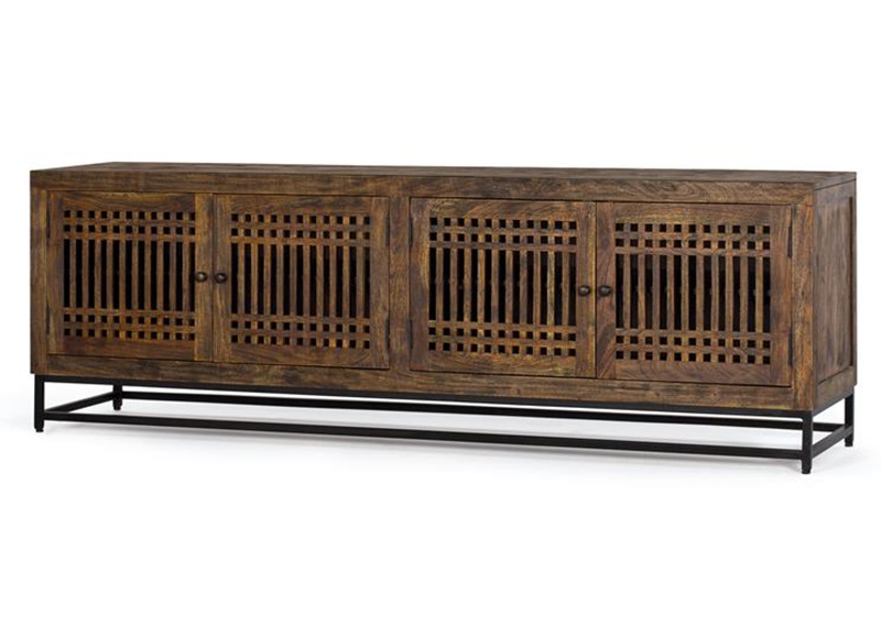 Mueble bajo de televisión grande moderno con 4 puertas, una pieza de diseño contemporáneo que elevará la estética de tu salón. Fabricado en madera maciza de acacia con un elegante acabado marrón nogal.