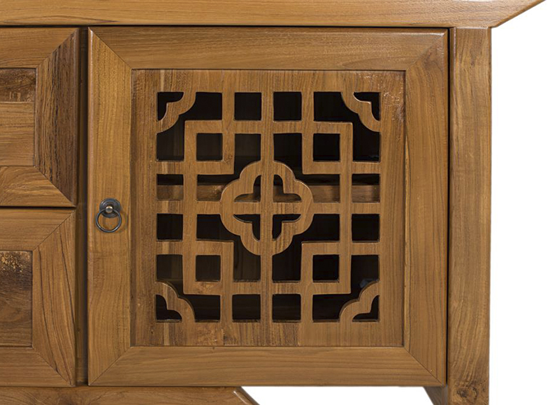 Mueble de televisión de teca maciza en color miel con cajones y puertas talladas de inspiración oriental. Diseño artesanal ideal para salones naturales.