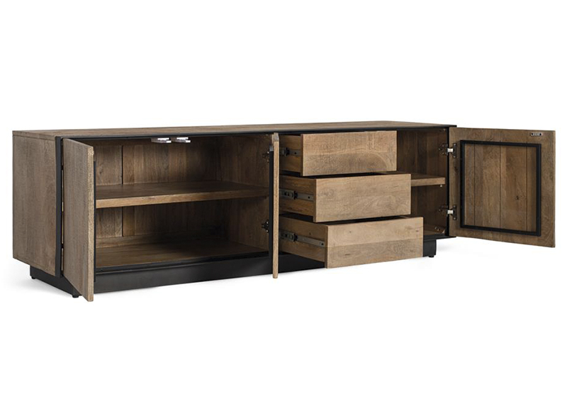 Mueble de TV rústico de madera de mango con estructura de hierro negro. Tres puertas y tres cajones con gran capacidad y diseño elegante.