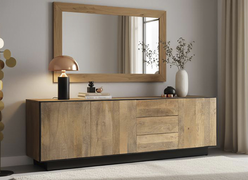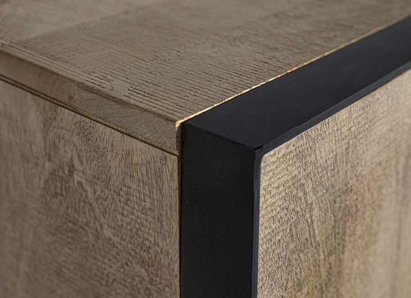 Este mueble de televisión de madera de mango natural combina diseño y funcionalidad con un marcado estilo entre rústico e industrial. Su estructura está enmarcada por un perfil de hierro en color negro que recorre todo el contorno y se integra con el zócalo metálico, aportando solidez, estabilidad y una estética contemporánea muy sofisticada.