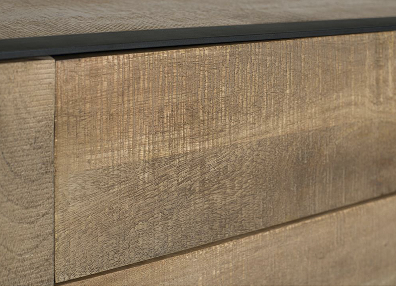 Dispone de tres puertas y tres cajones, ofreciendo una amplia capacidad de almacenaje para organizar dispositivos electrónicos, mandos y accesorios del salón. El acabado en madera natural mantiene visibles las vetas y texturas originales del mango, creando un atractivo contraste con los detalles metálicos que equilibra a la perfección lo rústico y lo moderno.